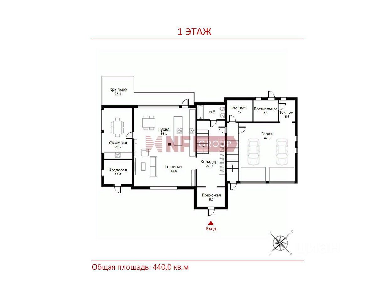 1 этаж: гостиная, кухня, столовая, комната для персонала-постирочная, терраса, выход на придомовую территорию, гараж на два автомобиля;