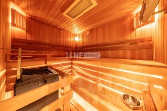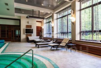 1 этаж: прихожая, санузел, гардеробная, лифт, большой парадный холл с выходом на террасу, гостиная, кабинет, кухня-столовая с большой летней террасой , кладовая, санузел, зона SPA — бассейн, сауна, русская баня с купелью и выходом на террасу , су, душевая.