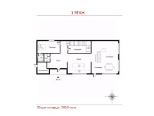 1 этаж : кухня с островом, гостиная с био камином, столовая, гостевой санузел, кладовка , гостевая спальня с санузлом, выход на патио.