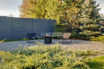 Территория 7 соток оформлена профессиональным ландшафтным дизайном с селективными соснами и плодовыми деревьями. Во дворе — уютная лаунж-зона с дровяным камином, который можно использовать как мангал.
