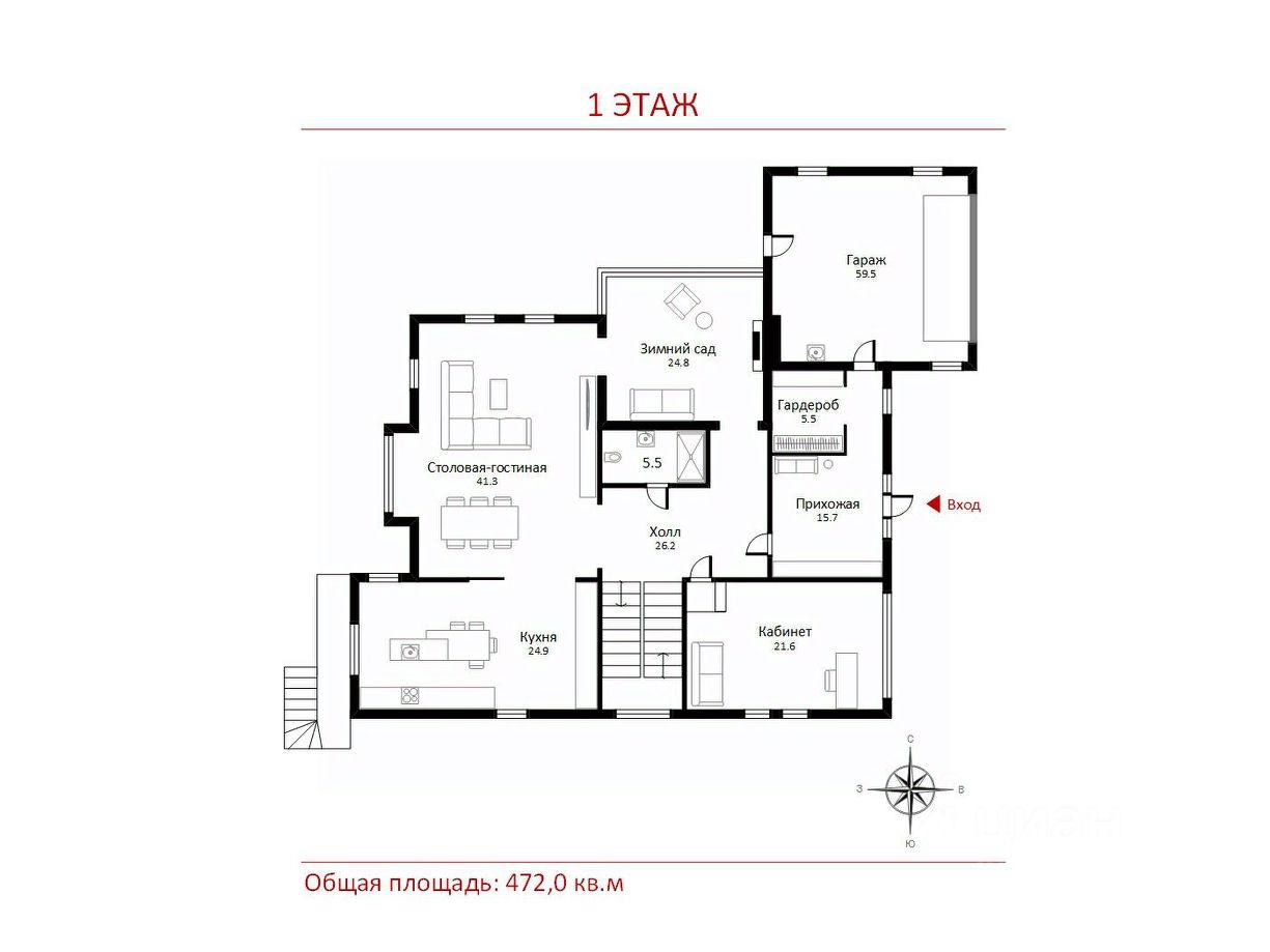 1 этаж: прихожая, холл, гардеробная, су, кабинет, кухня, гостиная-столовая, зимний сад, гараж на 2 м/м;