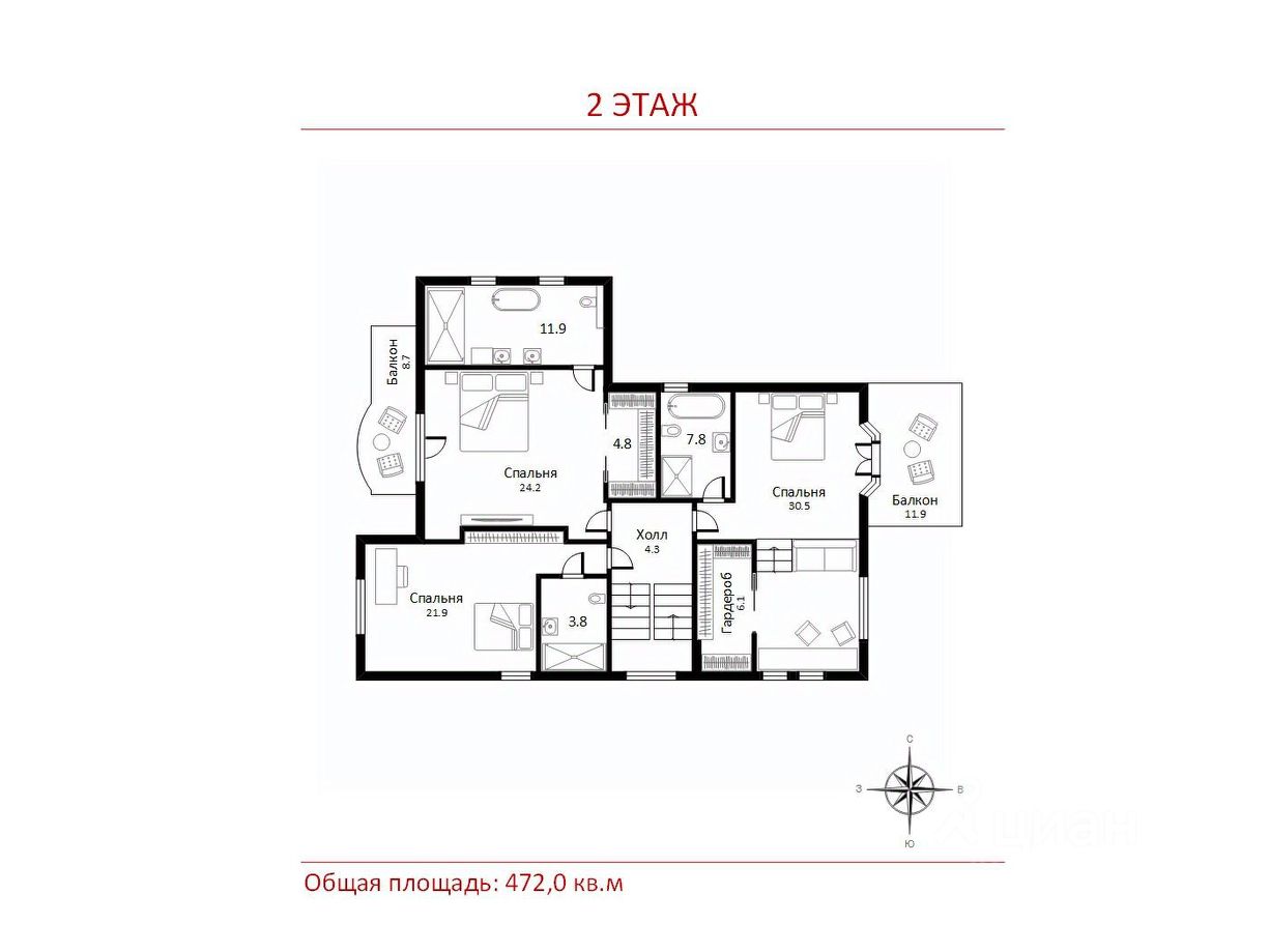 2 этаж: холл, детская спальня со своим с/у, большой детский блок: спальня, гардеробная, ученическая, ванная комната, балкон, мастер блок: спальня, гардеробная, ванная комната, балкон;