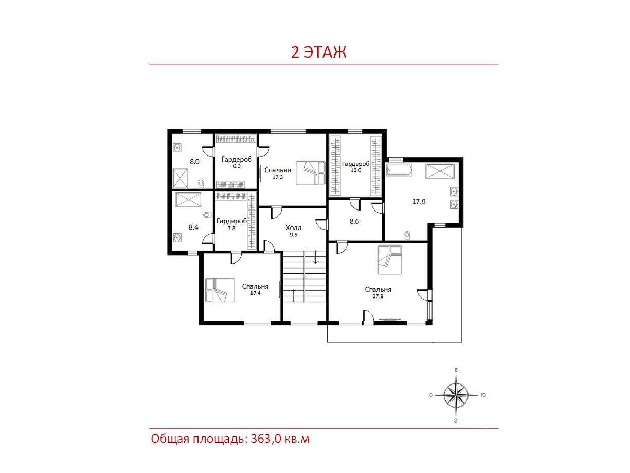 2 этаж: холл, мастер спальня с су и гардеробной, спальня с су и гардеробной, спальня с су и гардеробной.