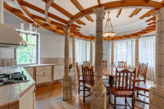 Трехэтажный дом построен в замковом стиле по проекту архитектора Михаила Филиппова, а дизайн интерьера выполнен в стиле Шале. Сам по себе этот дом подчеркивает уют и самобытность для своего будущего владельца.