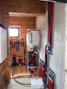Установлены газовый и электрический котел. Во всех комнатах установлены радиаторы. Проложен водяной теплый пол по всему первому этажу.