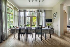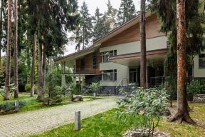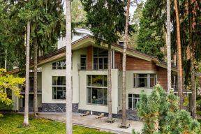 В отделке фасада - натуральный камень, штукатурка и дубовые панели.