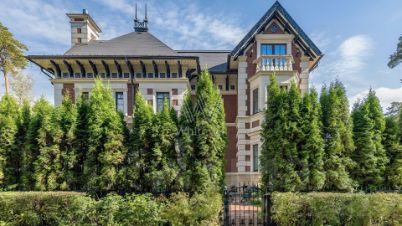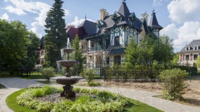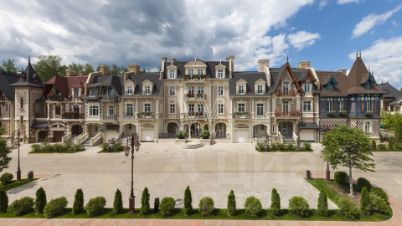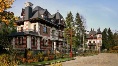 Трувиль. Загородный дом площадью 365 м² расположен на участке 18,3 сотки рядом с лесным массивом. Архитектура выдержана в нормандском стиле — фасад объединяет терракотовый кирпич с натуральным камнем, формирующим выразительные полосы и угловые акценты. Крыша из тёмного шифера подчеркнута резными кронштейнами, центральная часть выделена портиком с колоннами и арочными проёмами. Образ дополняют эркеры, балкон с каменной балюстрадой и декоративные фризы.