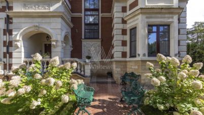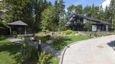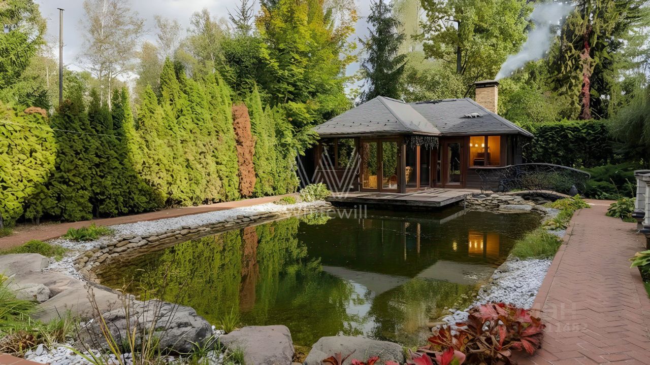Пространство участка продумано до мелочей: высажены зрелые деревья, кустарники и цветники, проложены аккуратные дорожки, установлено мягкое освещение. Центром ландшафтной композиции стал пруд с природным каменным обрамлением и беседкой у воды, где оборудована кухня и зона для барбекю. Дополняет инфраструктуру гараж на две машины с отдельной квартирой для персонала.
