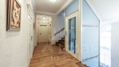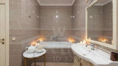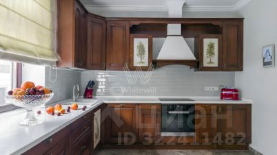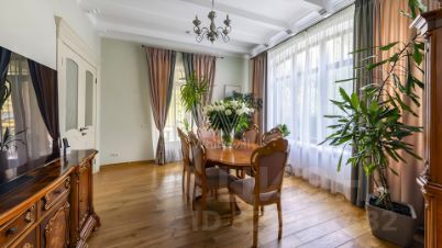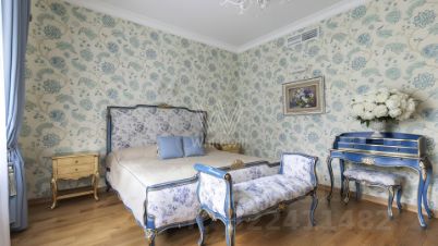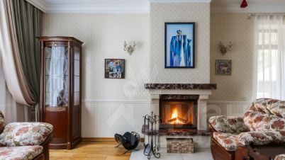 Интерьеры оформлены в европейской классике. Светлая палитра пастельных оттенков и тёплое дерево создают уютную атмосферу. Полы с фактурой древесины гармонируют со стенами, отделанными обоями с геометрическими и растительными мотивами. Потолки украшены молдингами и розетками, а в столовой использованы декоративные балки. Мебель из массива с резными элементами и витринные шкафы с изящными фасадами поддерживают единый ансамбль.