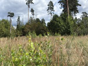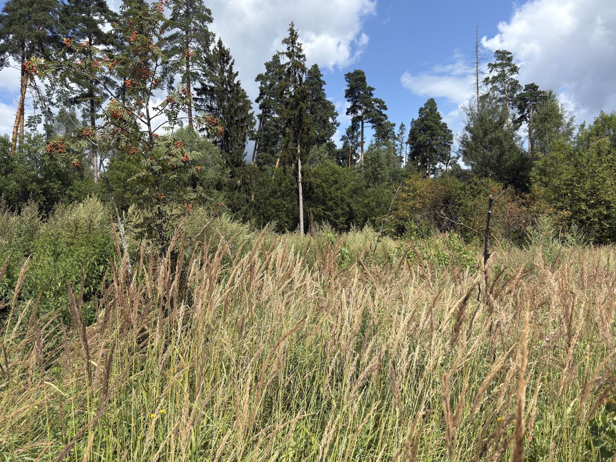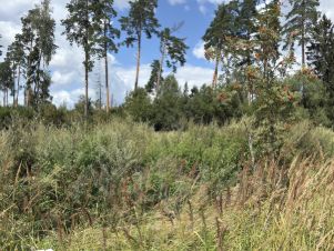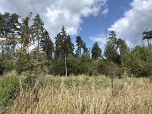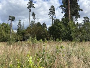 Участок расположен обособленно. С двух сторон граничит с лесом. Часть участка лесная есть 10 сосен и несколько дубов.