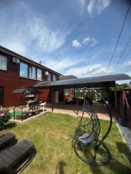 Участок ооорожен по периметру, двор ухожен, озеленение, газон, ландшафт, навес для нескольких автомобилей.