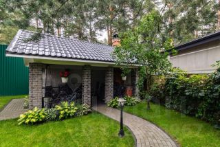 На участке выполнен ландшафтный дизайн в английском стиле и оборудована беседка с печью и мангалом. Фасад дома в идеальном состоянии. Респектабельное окружение.