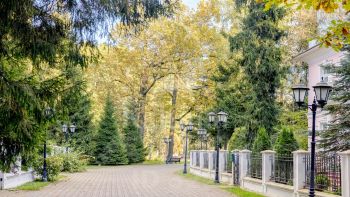 На участке проведены ландшафтные работы, растут реликтовые сосны и ели.