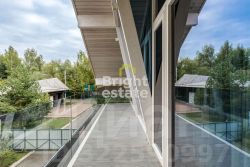 Интерьер в стиле "эко-минимализм" наполнен светом и воздухом. Панорамные окна от пола до потолка открывают виды на зелёные кроны, а солнечные лучи мягко скользят по натуральным фактурам. Просторные балконы под большими свесами кровли — идеальное место для утреннего кофе или вечернего уединения, а терраса словно создана для дружеских встреч и семейных ужинов на свежем воздухе.
