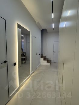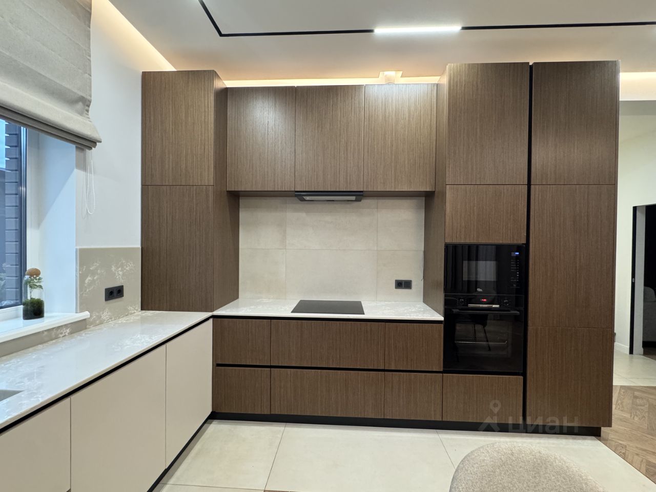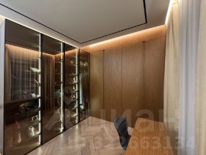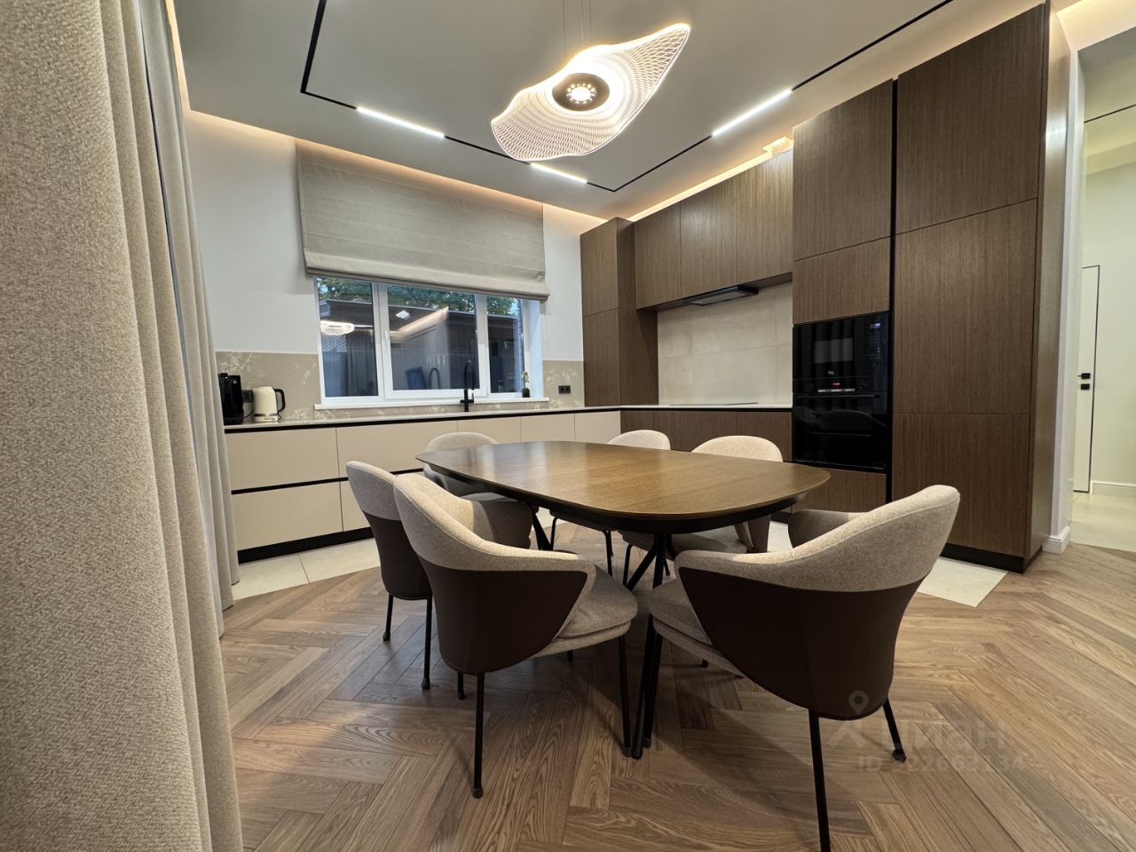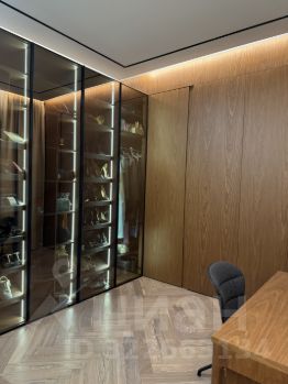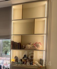 Все фасады (включая кухню, кабинет, детская, шкафы в комнате) выполнены из натурального шпона, эмали (прихожая, котельная), в части шкафов подсветка полок.