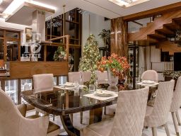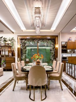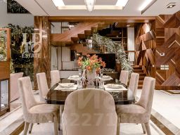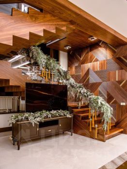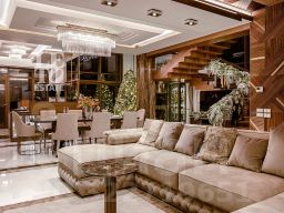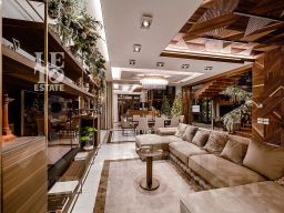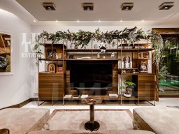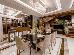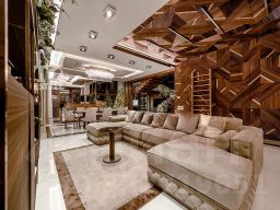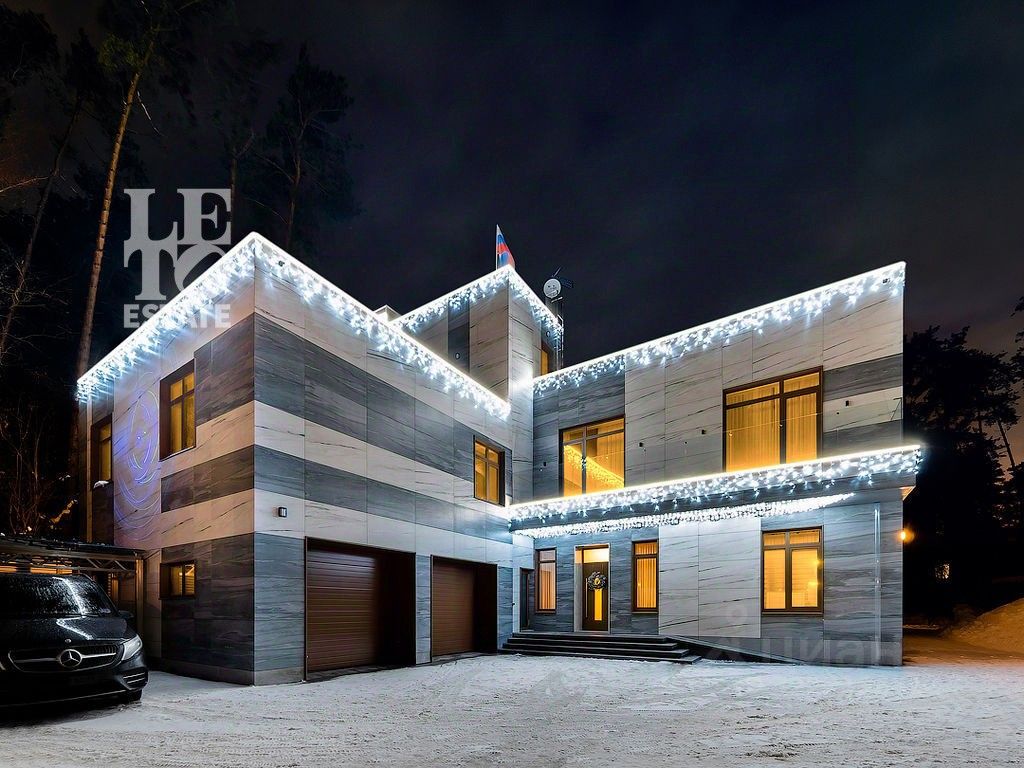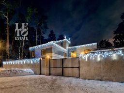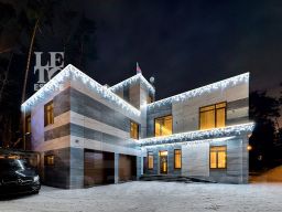 Современный фасад в светло-бежевых и серых тонах подчеркивается элементами декоративной подсветки. Внутри выполнена премиальная отделка с использованием натуральных материалов — стены и многоуровневые потолки украшены панелями из ценных пород дерева. Дом оснащен системами для подогрева полов, приточно-вытяжной вентиляцией и кондиционированием.