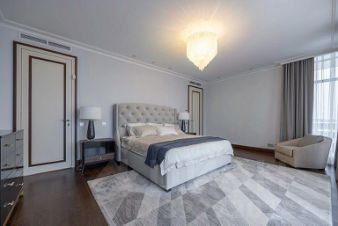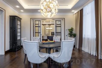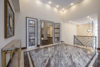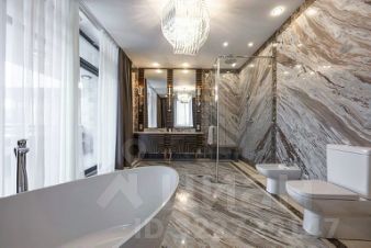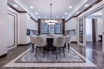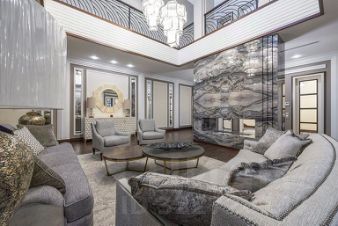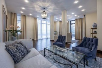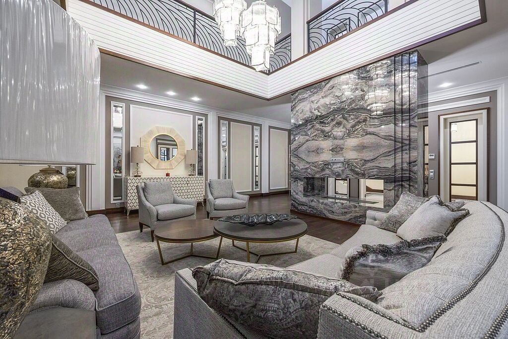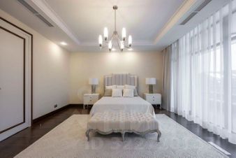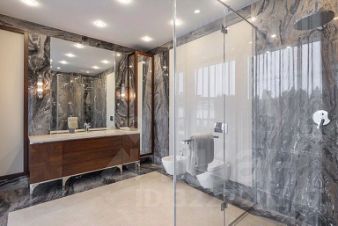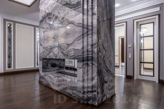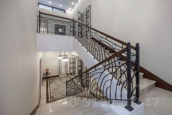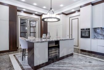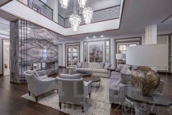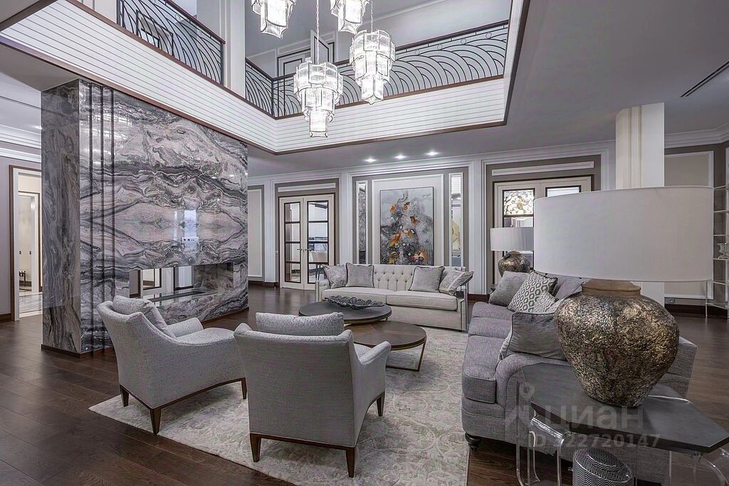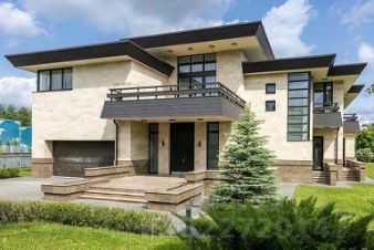 Особняк площадью 943 кв. метра готов к проживанию, продаётся в состоянии "под ключ" без мебели. Фасад с панорамными окнами отделан натуральным камнем, с фрагментами обшивки доской из лиственницы.