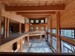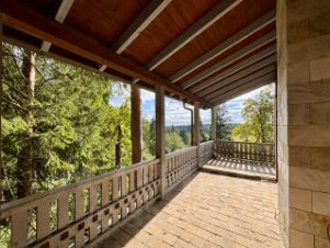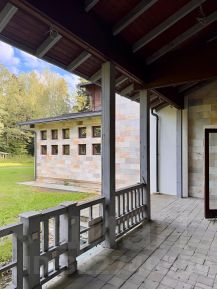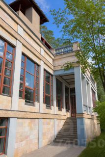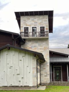 Облицовка - натуральный камень (песчаник и известняк различных оттенков). Камень комбинируется с деревянными элементами из клеенного бруса. Для внутренней отделки использован сибирский кедр.