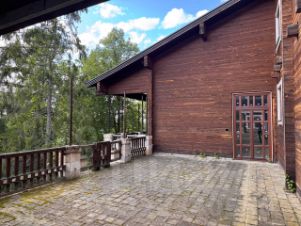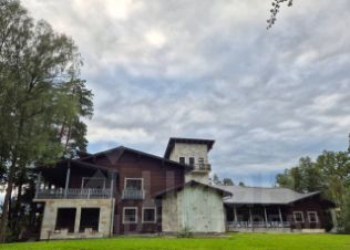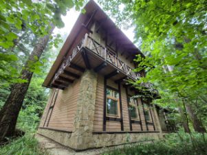 На участке расположен охотничий домик под ключ в стиле прованс площадью около 110 м²: две спальни, на первом этаже санузел и сауна, гостиная с камином, кухня столовая, терраса и зона отдыха.