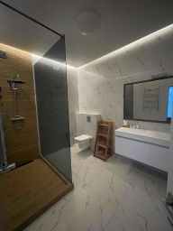 5 уровень: мастер -спальня, большой с\у с душем и двойной раковиной, гардеробная, балкон. Вторая спальная комната с гардеробной, с\у с ванной - водяные тёплые полы и радиаторы, пол керамогранит.