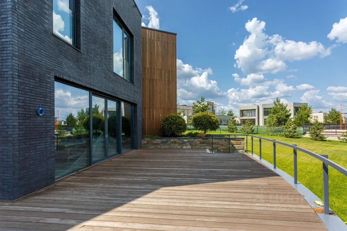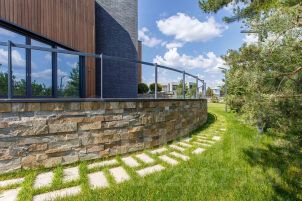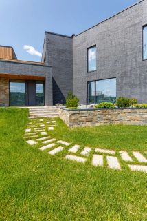 Фасад дома отделан клинкерной плиткой Feldhaus, натуральным сланцем, лиственницей. Терраса первого этажа - лиственница, натуральный сланец. Терраса на 2ом этаже покрыта доской и природной галькой. Построен уличный дровяной камин.