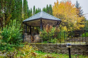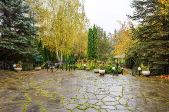 На участке: домик для персонала, беседка, уличная кухня с барбекю и коптильней, организованы несколько зон отдыха, отдельно стоящий гараж на 1 м/м, навес для авто на 1 м/м (2 м/м перед домом).