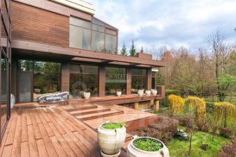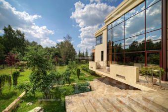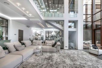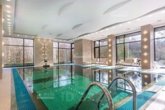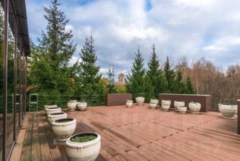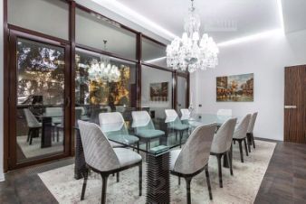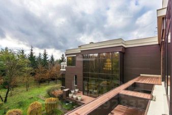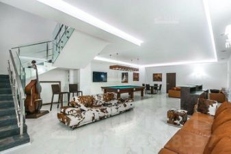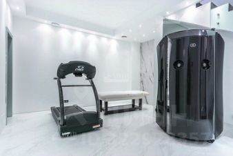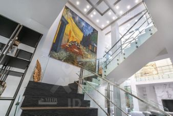 1 этаж: спальня с ванной комнатой; кабинет-библиотека; каминный зал со вторым светом (камин 120х90, бразильский мрамор); кухня (полностью с техникой, столешница из бразильского мрамора) - столовая; бассейн (9х4 с противотоком, переливной); сауна, санузел, раздевалка; выход вниз в спортзал, турбосолярий + санузел; из всех помещений 1-го этажа имеются выходы на круговой балкон.