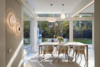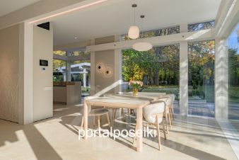 Столовая-гостиная также полностью укомплектована стильной мебелью в натуральном шпоне. Безопасные энергосберегающие просветленные стеклопакеты с теплой дистанционной планкой и заполнением аргоном. Двери Schco (Германия).