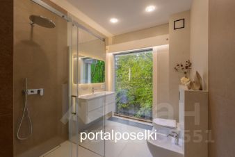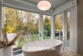 Потрясающие виды на собственный сад: старая плакучая ива и декоративная ёлочка отражаются в пейзажном бассейне в стиле чёрное зеркало. Тактичная подсветка растений и деревьев по периметру участка вечером раздвигает границы и дополняет уют на шикарном патио под сенью старинного орешника. Встроенная музыкальная система и отдельно стоящая на светящейся гальке ванна оставляют незабываемые впечатления от водных процедур.