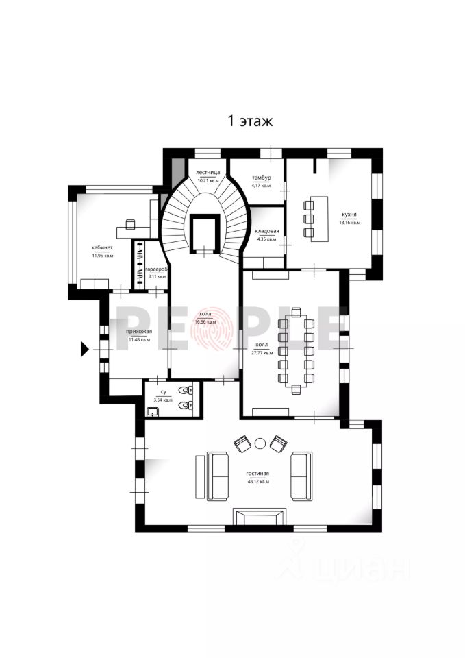 1-й этаж: холл, гостиная, столовая, кухня с кладовой для продуктов, кабинет, гостевой санузел.