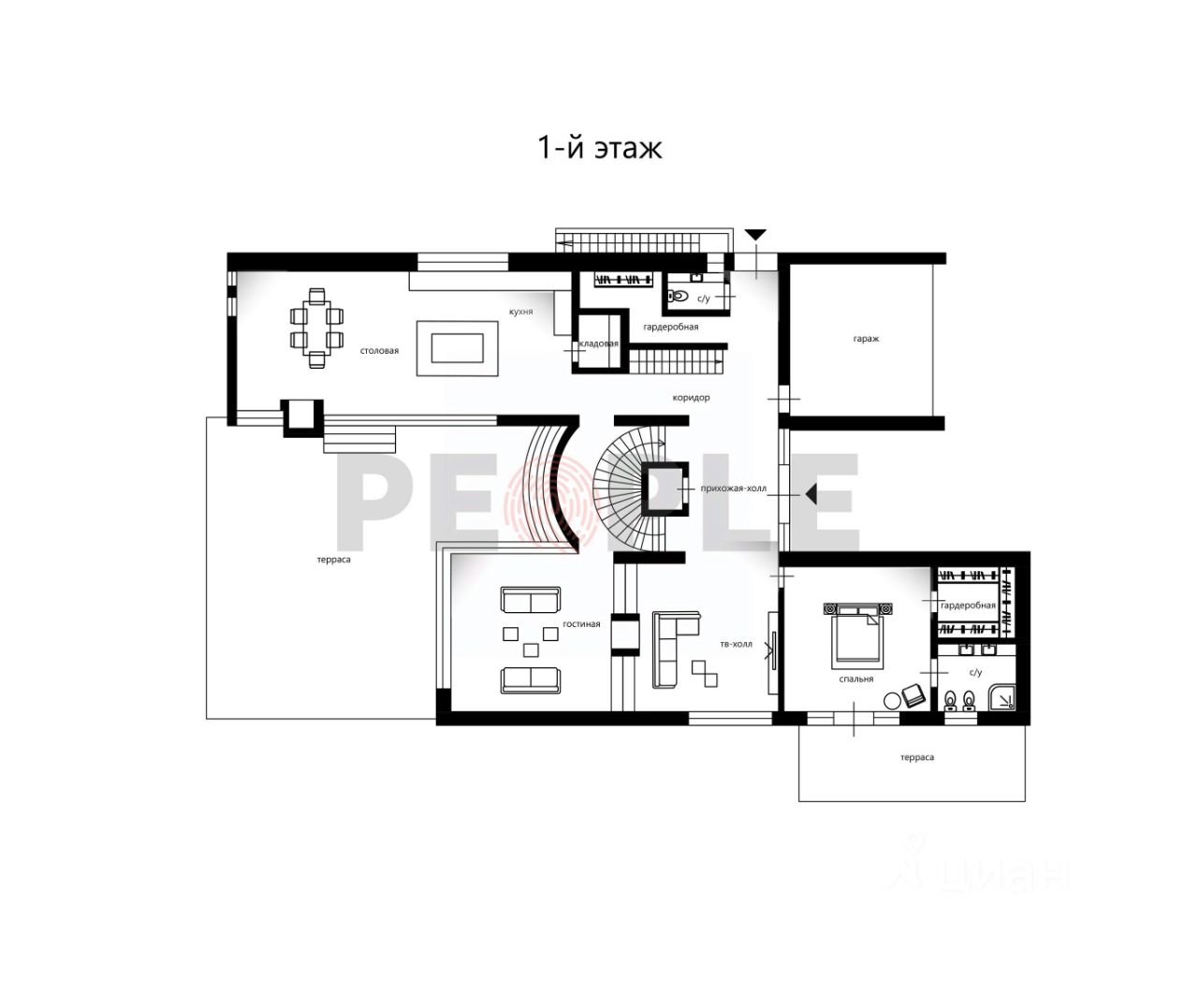 1-й этаж: холл-прихожая, гардеробная, гостиная с выходом на террасу, кухня-столовая, спальня с гардеробной и ванной, гостевой санузел, терраса, гараж