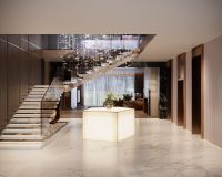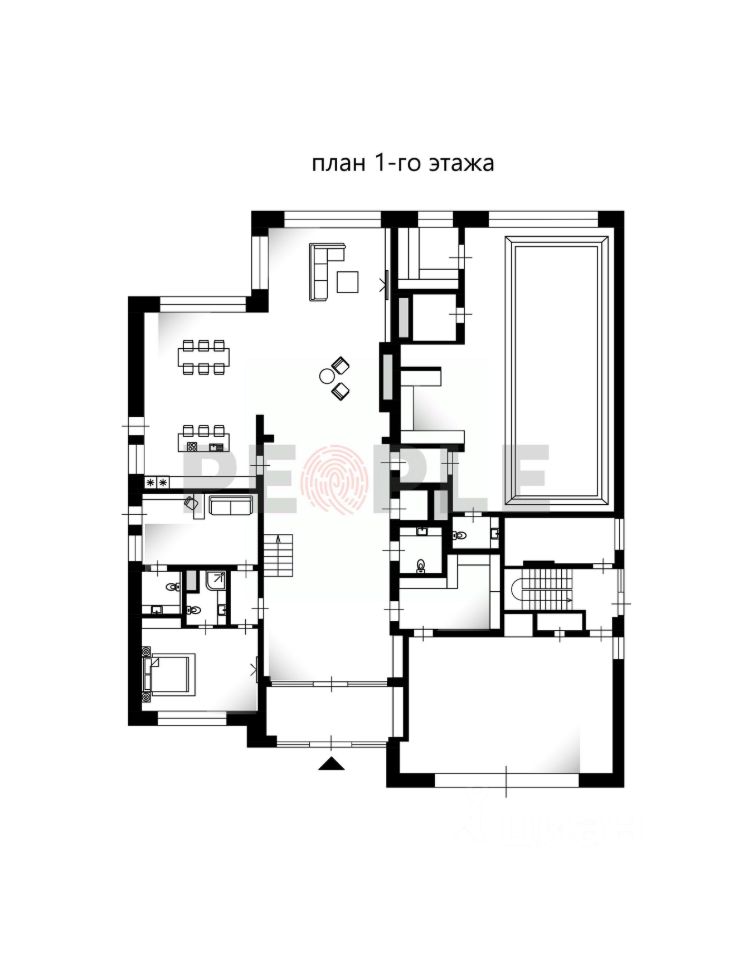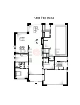 1-й этаж: прихожая, гараж, холл, лифт, гардеробная, санузел, гостиная, кухня-столовая, терраса, спальня с гардеробной и ванной, кабинет, SPA-комплекс с бассейном (12 метров), сауной, хаммамом, комнатой отдыха и душевой
