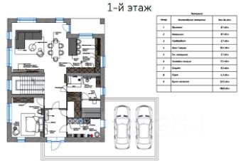 Этаж 1: прихожая, гардеробная, спальня, с/у, кухня-столовая, гостиная, сауна, кладовая, котельная, гараж на два автомобиля