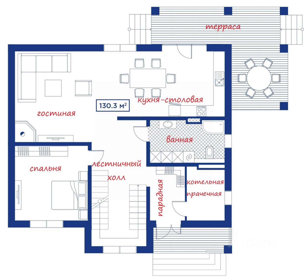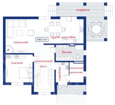 - Планировка: просторная светлая гостиная-кухня , 5 жилых комнат которые можно распределить по Вашему усмотрению (кабинет, мастерская, спорт-зал и т.п.), 2 просторные ванные комнаты, отдельная котельная, вместительный холл и большая светлая веранда . В доме есть возможность увеличить площадь дома и количество комнат (подробнее можно узнать у менеджера отдела продаж.