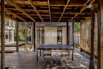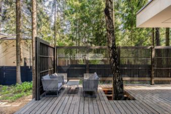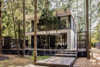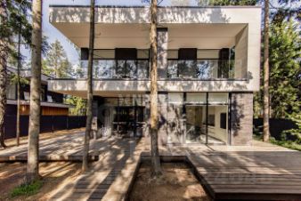 Из панорамных окон открывается потрясающий вид на лес, а крытые террасы доступны из каждого помещения дома.