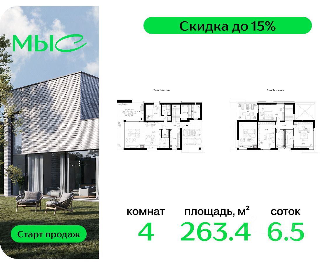 Прямая продажа от застройщика MR. Цена указана с учетом скидки 15%. Продаётся загородный коттедж без отделки в семейном природном кластере премиум-класса МЫС. Срок сдачи: III кв. 2028. Проект МЫС — это, прежде всего, идеальное место для семей. В рамках проекта построят государственную школу, два детских сада и дворец спорта площадью 20 000 м2 с термальным комплексом, выплывным бассейном, фитнес-залом, теннисными, сквош и падел кортами и секциями для детей. На территории площадью, сравнимой с тремя парками Зарядье, появятся кафе и рестораны, пруд с набережной, спортивные и детские площадки, скейт-парк, лыжные и веломаршруты. Расположение: - 2 минуты до скоростной трассы М1 и Минского шоссе; - 10 минут до МКАД; - 15 минут до МЦД Лесной Городок - 20 минут до делового центра "Москва-Сити"; - 28 минут до аэропорта "Внуково". Благоустройство: - велосипедные и лыжные маршруты; - собственная набережная и парк; - лаунж-зоны в окружении природы; - беседки у очага; - дворец спорта площадью 20 000 м²; - термальный комплекс с тремя бассейнами; - 4 теннисных и падел-корта; - 6 сквош-кортов; - многофункциональный спортзал; - скейт-парк; - просторная площадь для прогулок с фонтаном; - детский клуб с творческими секциями; - гастро-доминанта; - кафе у пруда, рестораны, ритейл. Окружение - соседство с лесным фондом; - школа на 1250 мест и 2 детских сада на 350 и 255 мест; - Дубковский и Подушкинский леса, парк "Рассказовка", Мещерский парк. Действуют специальные условия при 100% оплате, подробности уточняйте у менеджера в офисе продаж.