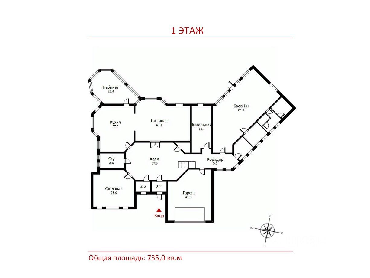 1 этаж: холл, гардеробная, кабинет, с/у, кухня с выходом на теплую крытую террасу, каминный зал, бассейн с противотоком, сауна, душевая, с/у, хоз.комната, бойлерная, гараж на 2 м/м.
