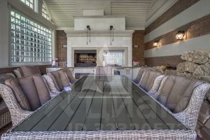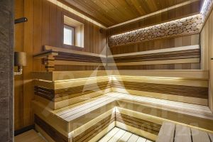 На участке расположен гараж на три автомобиля, с тренажерным залом, сауной и хамамом, с зоной отдыха, кабинетом и квартирой для персонала.