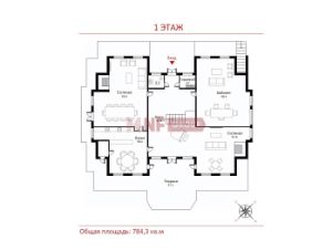 - 1-й этаж полностью состоит из общественных зон: холл, гостиная, столовая-гостиная, кабинет, кухня с зоной для завтрака. Симметричное четырехчастное планировочное решение по принципу Паладио позволяет воспринимать все это пространство как единое целое, при этом оставляя возможность зонирования и разделения пространств, уединения для каждого члена семьи и исключения пересечения потоков и функций;