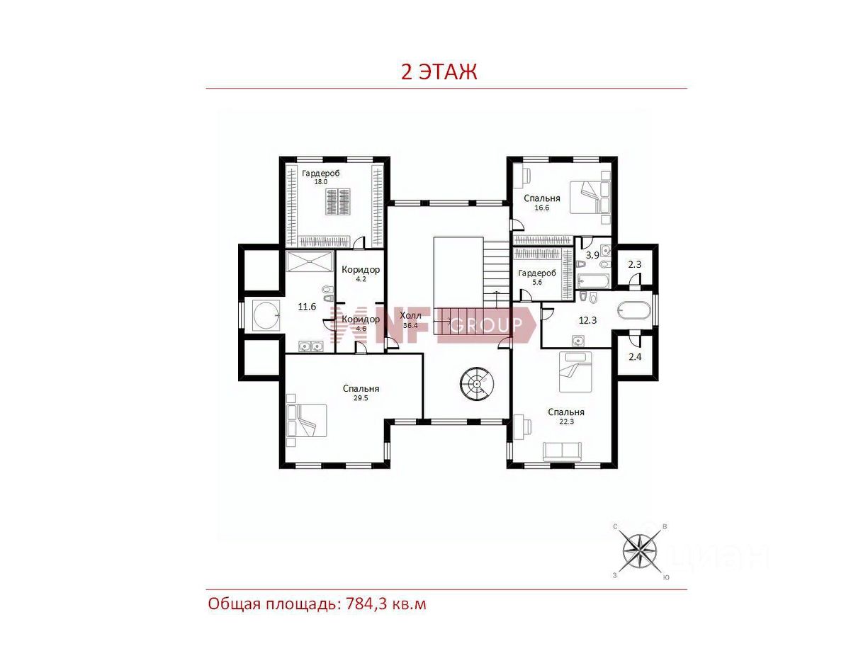 - 2-й этаж три спальни с отдельными санузлами и гардеробными (в том числе мастерспальня);