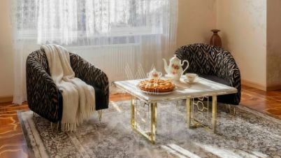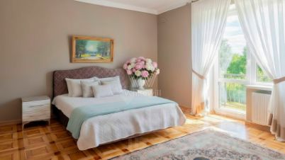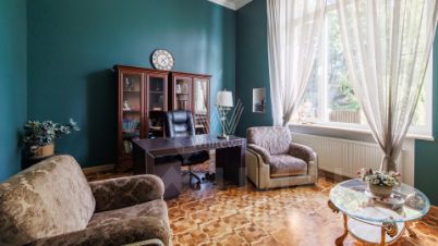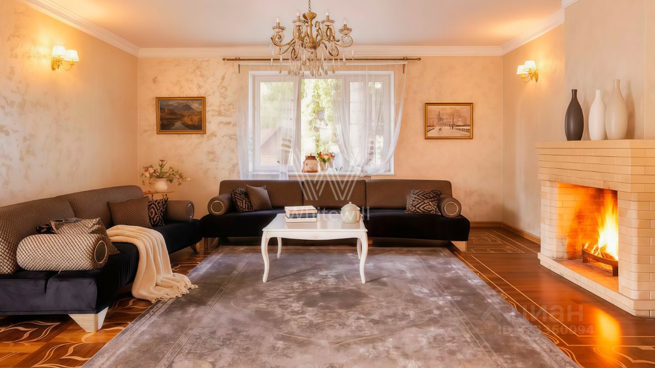 На первом этаже спланирована просторная светлая гостиная с камином и оборудованная кухня. На полу — наборный паркет из ценных пород дерева. В доме шесть спален, гостиная, кухня-столовая, кабинет и четырёхместный гараж. На участке у дома дорожки вымостили камнем, засеяли ровный газон и провели санитарную обработку деревьев.