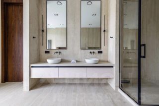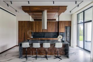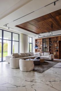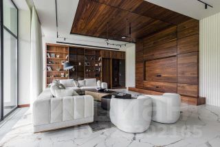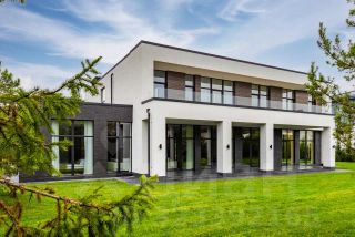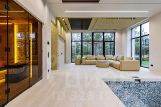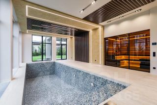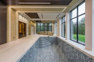 - 1 этаж: просторная кухня-столовая-гостиная, спальня с собственным санузлом и гардеробной, дополнительная спальня, санузел, гардеробная, котельная, терраса, гараж на 2 автомобиля, бассейн и сауна.