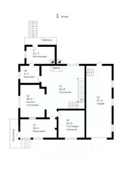 1 этаж: прихожая с гардеробной, гостевая спальня, гостиная с камином, кухня-столовая, с/у, котельная, терраса, гараж на 2 авто.