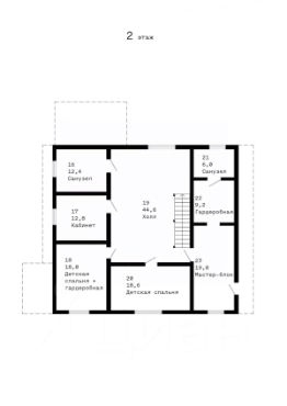 2 этаж: свободный холл, мастер-спальня с гардеробной и с/у, детская спальня, спальня-гардеробная, кабинет, ванная комната.