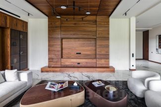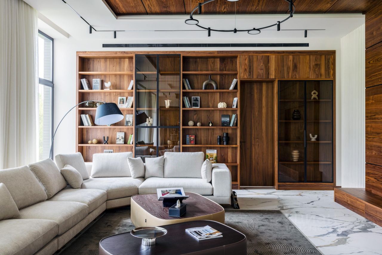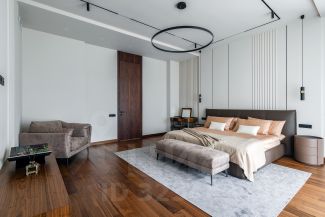 Дизайн интерьера выдержан в минималистичной эстетике — спокойные натуральные оттенки, тёплые текстуры дерева, высококачественные материалы.