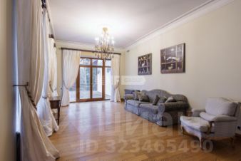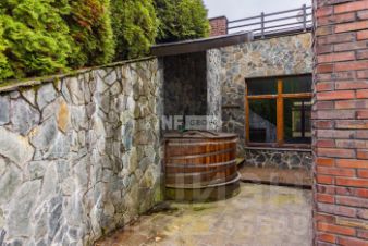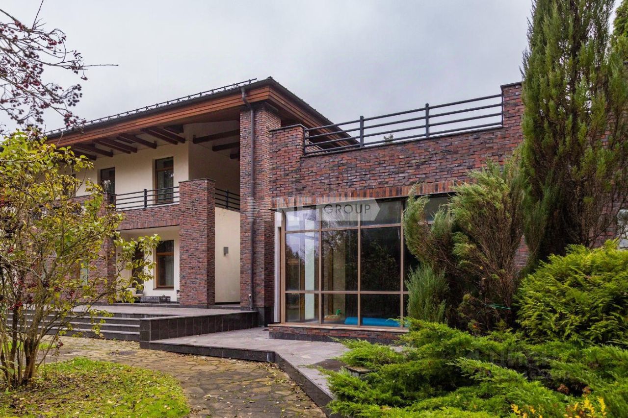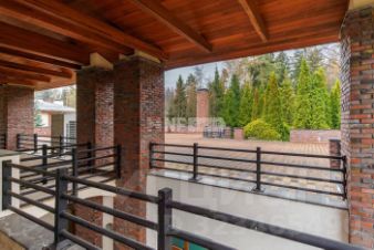 участке с дорогим ландшафтным дизайном, в охраняемом коттеджном поселке "Мозжинка". Усадьба состоит из трех строений: основной дом, соединенный подземным проходом со служебным флигелем, в котором расположен