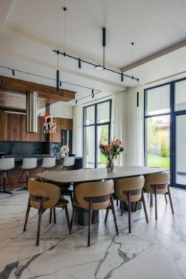Дом полностью отделан и меблирован, готов к постоянному проживанию. Интерьер выполнен в современном стиле, в светлых, мягких пастельных тонах, с использованием декоративных элементов из дерева.