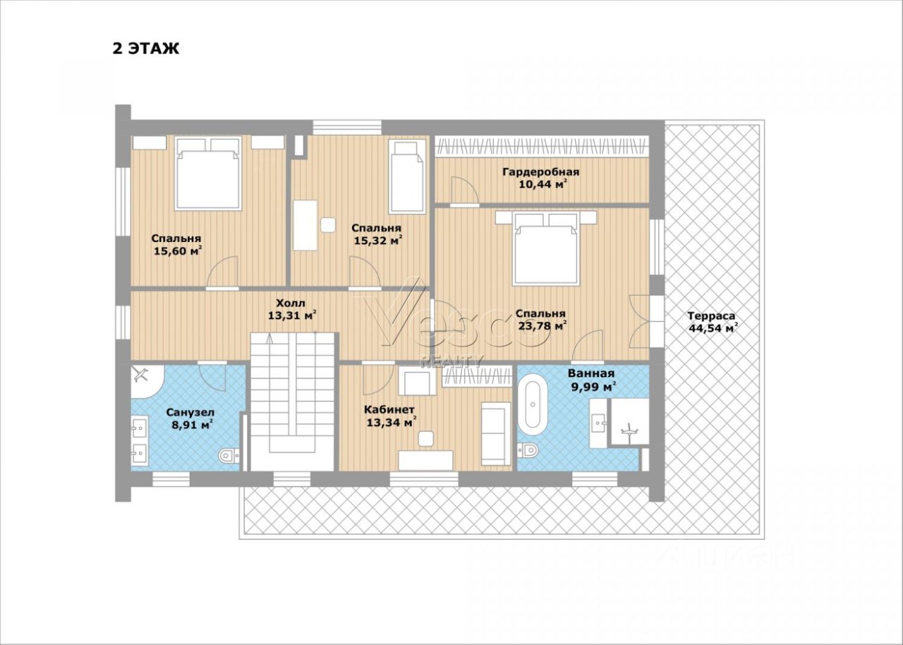 2 этаж: спальня с санузлом и гардеробной и выходом на огромный балкон, кабинет, санузел, 2 спальни.