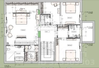 2 эт: 3 спальни, все со своим с/у (теплые полы), и гардеробной. Есть не учтенное помещение, кот. можно оборудовать под кабинет. На втором этаже тоже высокие потолки.