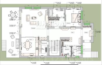 1 эт: веранда, холл, котельная, с/у, спальня со своим с/у и гардеробной, постирочная, огромная столовая - гостиная (более 50 км.м.) с выходом на большую на террасу с лестницей для спуска в сад.